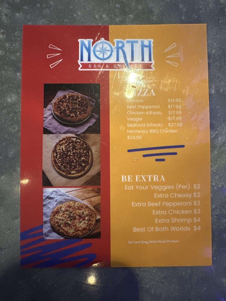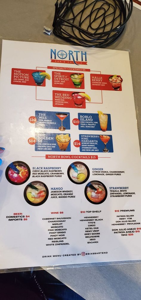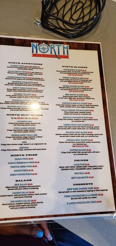 North Bar & Grille offers amenities such as Outdoor Parking, Parking Lot, Valet Parking, Happy Hour, Casual Ambiance, Accepts Contactless Payments, ensuring a comfortable and convenient experience for clients.